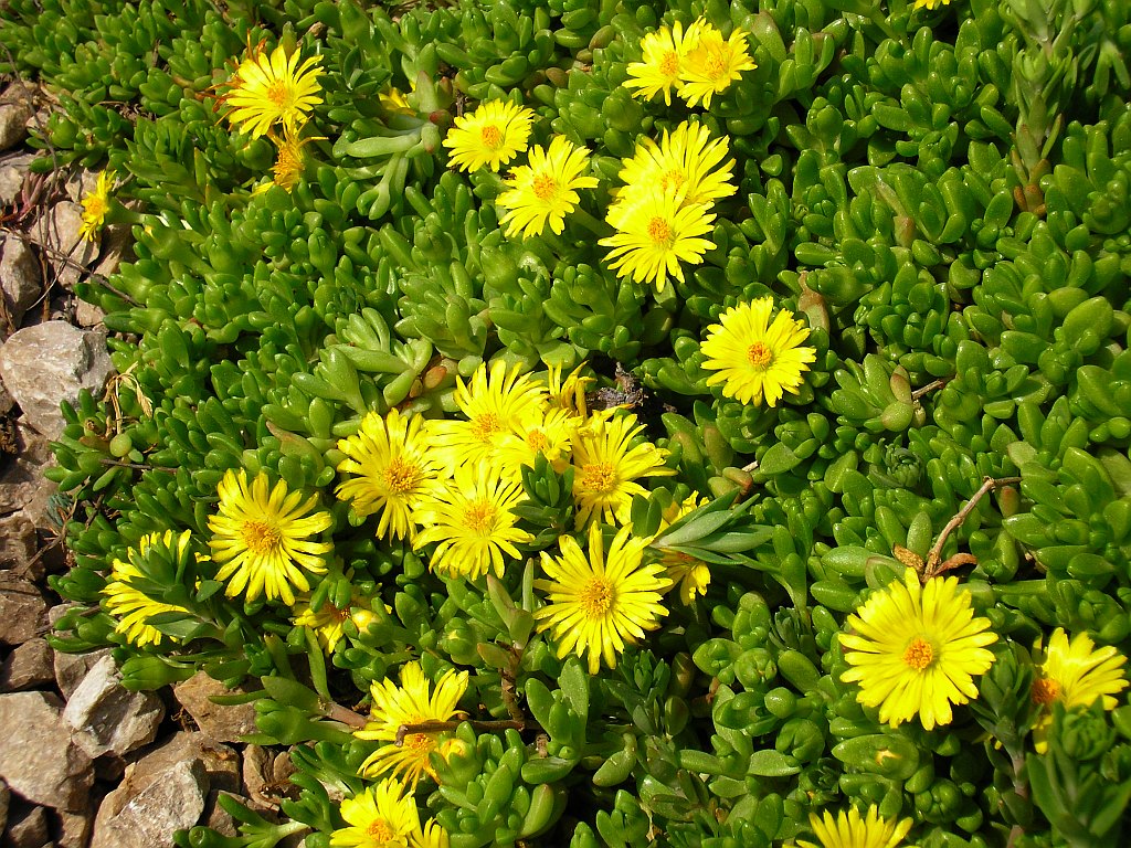 Délvirág, (Delosperma nubigenum,) pozsgás talajtakaró, most kezdi a virágzást.Nem szereti ha túlöntözik.