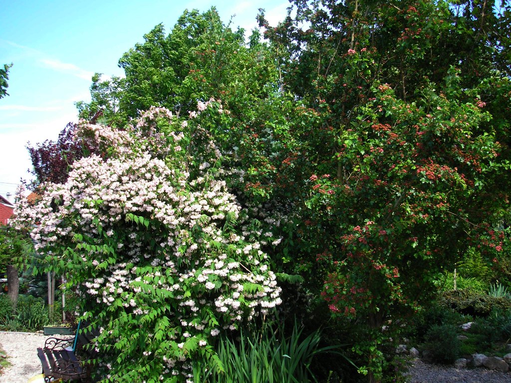 A kínai lonc mellett a tűztövis virágzik.( Pyracantha coccinea)